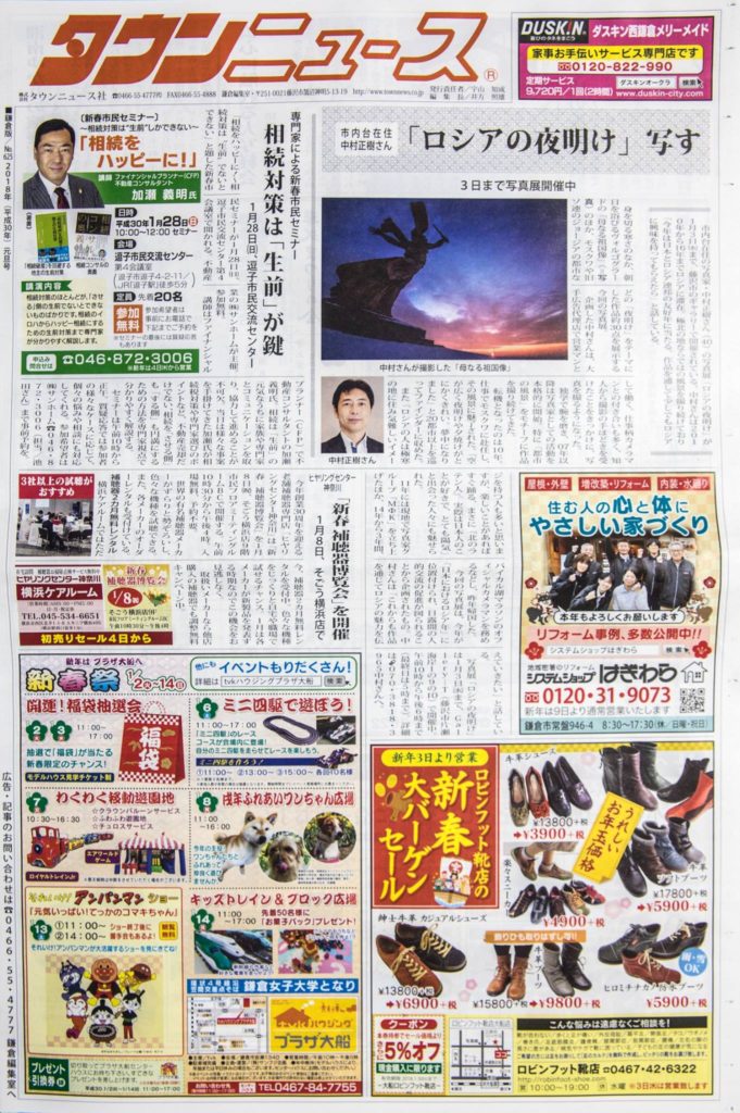 タウンニュース(鎌倉市版)に「ロシアの夜明け」写真展開を取材頂きました。お正月紙面の1面を飾らせていただきました。