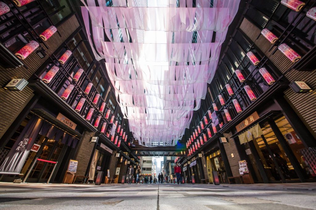 桜の開花はもう少し先だけど、日本橋での桜フェスティバル。夜行くとライトアップしています。