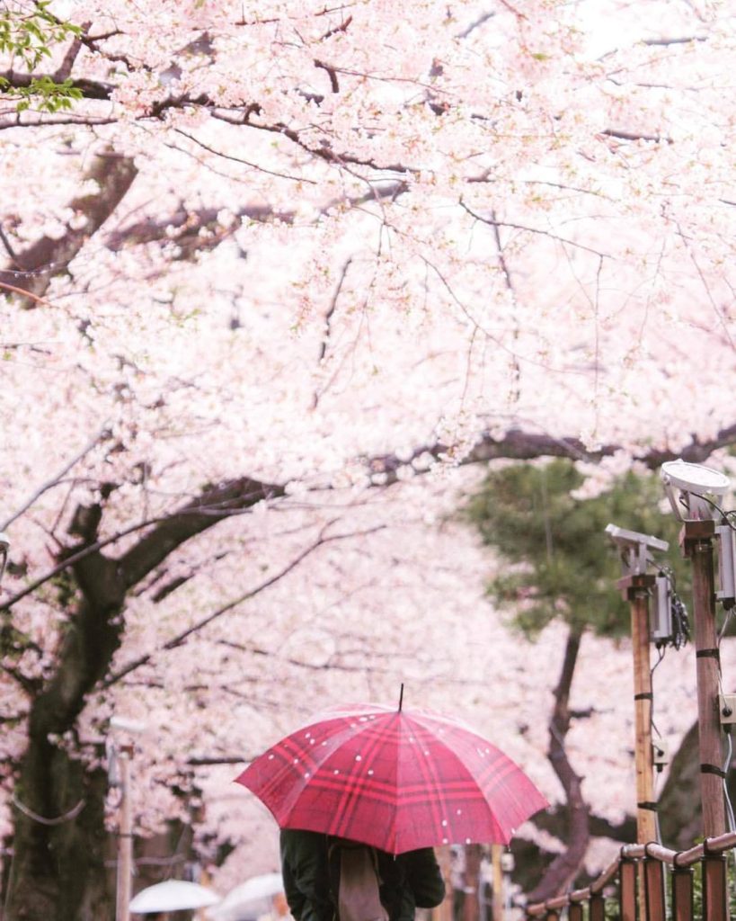 奥様は桜撮影に夢中。そこで何も言わずそっと旦那様が傘で雨除け。阿吽の呼吸が淡い桜色の中でつながりました。