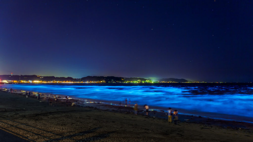 夏は花火、冬はオーロラ、初夏は蛍。夜に輝く主役たちはいくつもありますが、珍しく夜光虫の海。海に天の川が落ちてきたような美しさ。オーロラより珍しいらしいです。