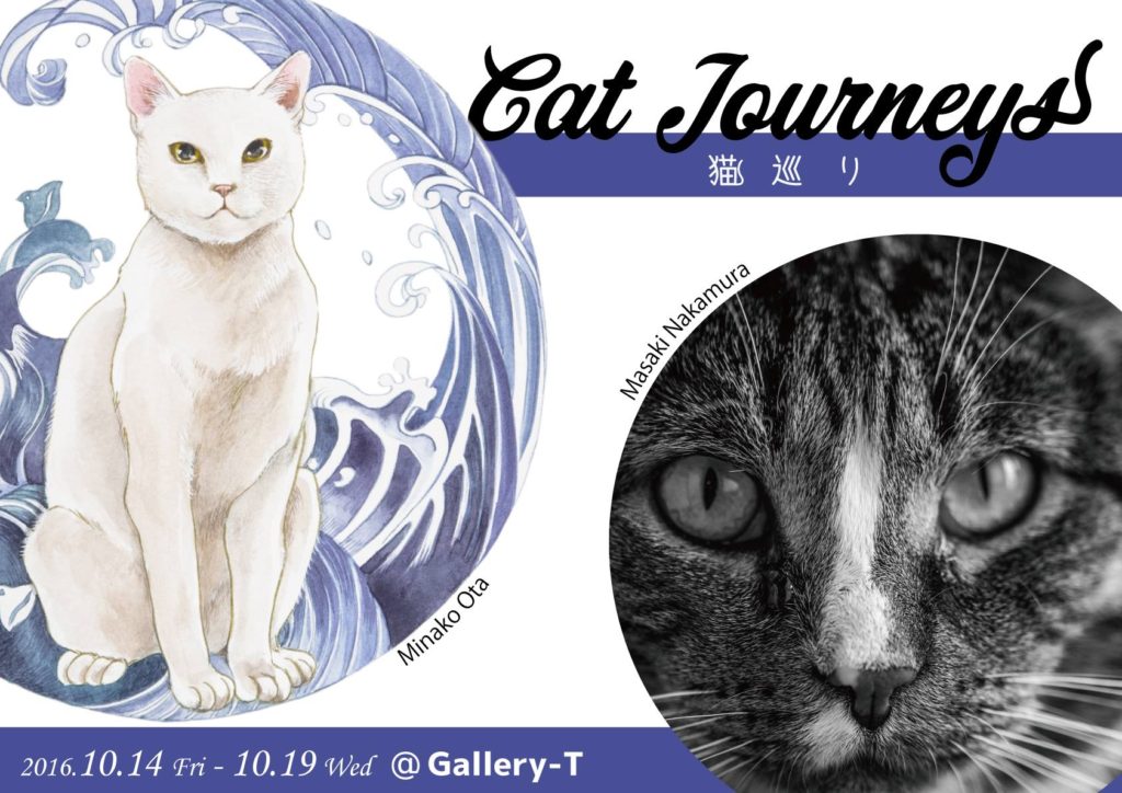 タイトル:「猫巡り - Cat Journeys -」展 会期:2017年10月14日(金)~10月19日(水) 10:00〜18:00(最終日は17:00 まで) 場所:Gallery-T(www.gallery-t.net) 神奈川県藤沢市片瀬海岸1-9-10 Tel.0466-22-4057 ( 代表. 玉屋) 小田急線・片瀬江ノ島駅より徒歩5 分、江ノ電・江ノ島駅より徒歩2 分 湘南モノレール・湘南江ノ島駅より徒歩3 分 入場料:無料 Facebookイベントページ:https://www.facebook.com/events/1459608320752264/
