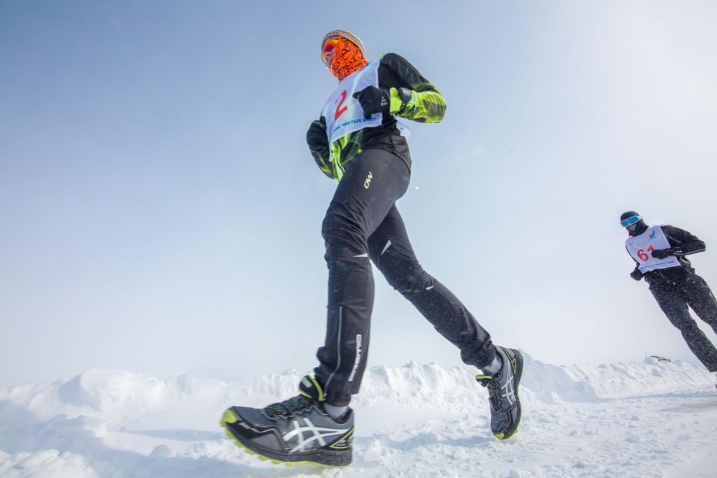 2016年のバイカル湖アイスマラソンは足元の粉雪が深く、砂浜を走るように足に絡みついてきて走りにくいコンディション。それでも各ランナーは必死にこの湖の上を駆け抜けていきます。