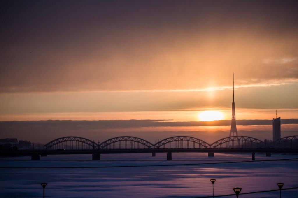 ラトビアのダウガバ川にかかる橋の向こうから昇る日の出。奥には北欧最大の建築物であるテレビ&ラジオ塔が朝日を迎えます。