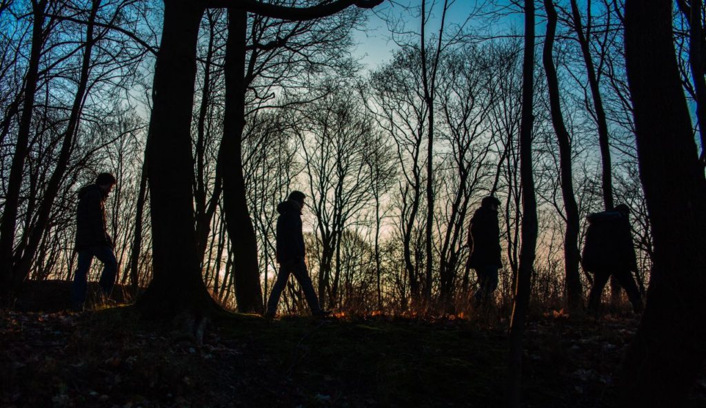 ロシアの極西、飛び地になっているカリニングラード。冬は曇りがちだが、気持ちいい朝日の時は散歩に限る。二日酔いながらのんびり歩くおじさん4人組。(カリニングラードの朝)